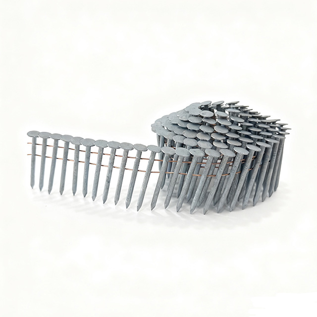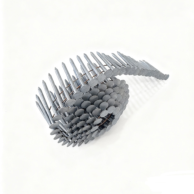 It is a roll packed nail made of high-quality low-carbon steel such as Q195 and Q235, which forms a thick zinc layer on the surface through hot-dip galvanizing process. It is matched with a large umbrella shaped nail cap with a diameter of 8.8mm-9.2mm, a nail body diameter of 2.96-3.05mm, a length of 3/4 inch -1-3/4 inch, and various nail body types such as bare body and ring pattern. It is compatible with roll nail guns such as CN55-CN130 and can achieve continuous and efficient operation. It is a commonly used fastening accessory in the industrial and construction fields.